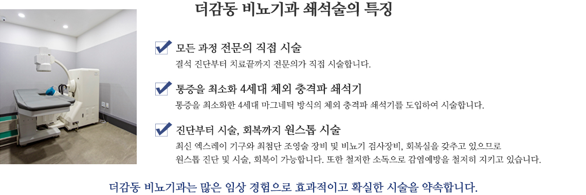 결석의 위치 및 크기 환자의 평소 복용 약물 유무나 전신 상태 등을 검사하고 총체적인 치료방향을 결정하여 시술합니다.
